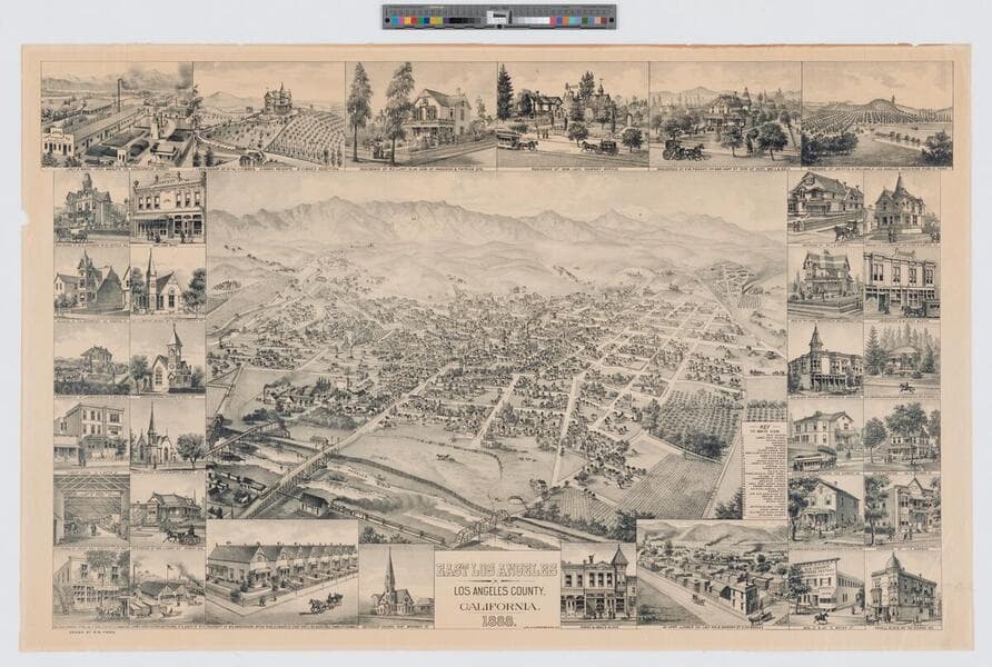 - Image of an aerial view of East Los Angeles, California, with an inset map key, surrounded by thirty-four vignettes of buildings and street scenes with captions.