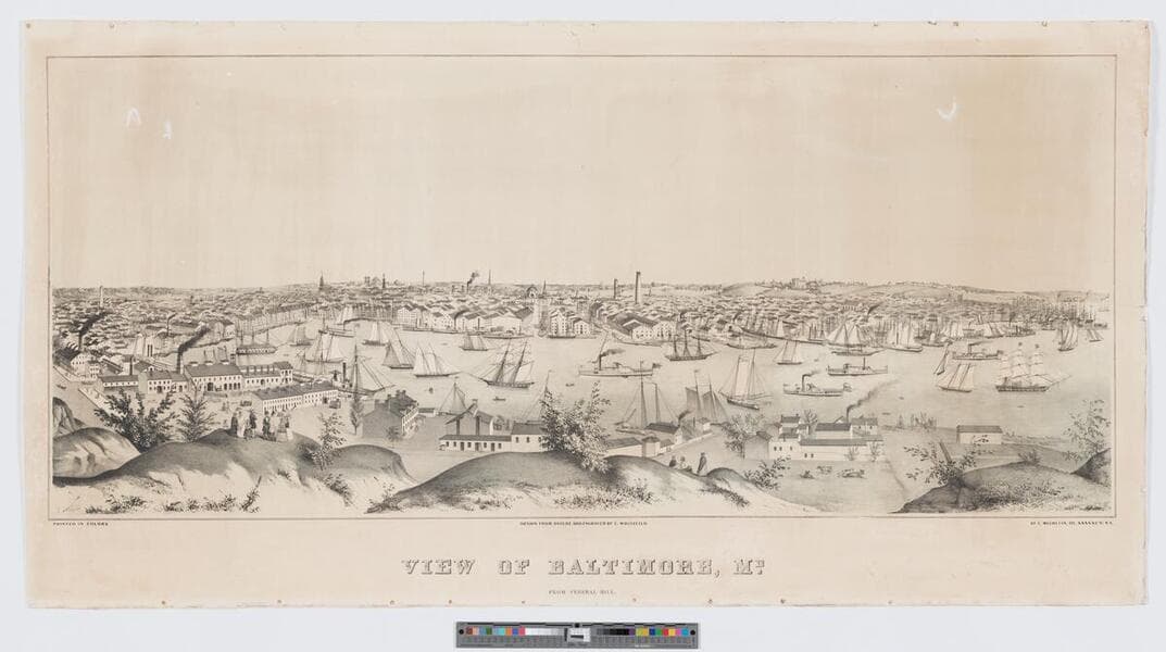 - Image of an elevated landscape view of Baltimore, Maryland, from Federal Hill showing sightseers on the hillside in the immediate foreground, and houses, yards with cows, boats in the harbor, and the cityscape across the water into the distance.