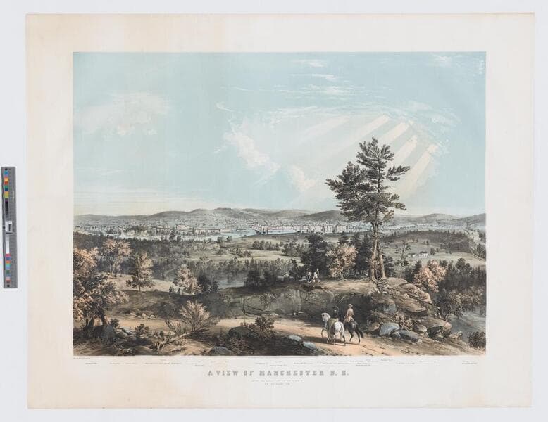 - Image of an elevated landscape view of the town of Manchester, New Hampshire, and the Merrimack River from a distant hillside showing a man and woman riding horses and people having a picnic in the foreground; locations printed in margin.