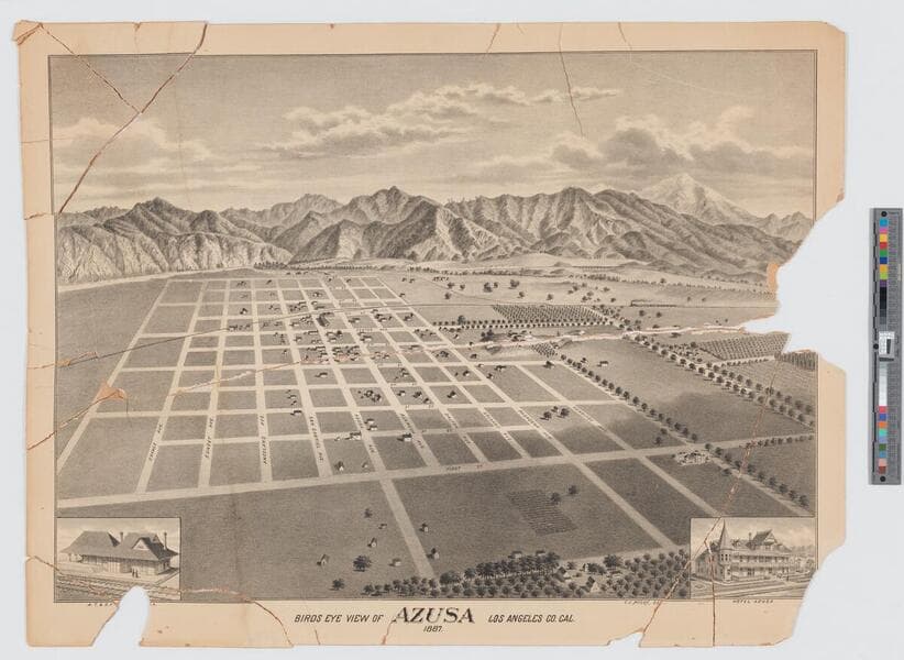 - Image of an aerial landscape view of the city of Azusa, California, showing the street names, mountains in background; and two vignettes of eye-level street views of the train station and the Hotel Azusa in the bottom corner margins.