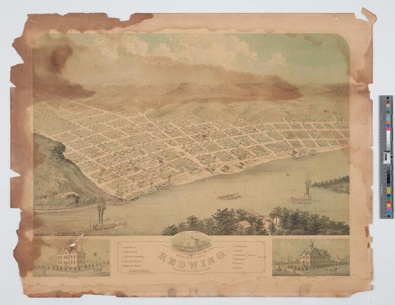 - Image of an aerial landscape view of the city of Red Wing, Minnesota, showing steamboats on the Mississippi River in the foreground; with three vignettes in the lower margin of eye-level street views of the public school, Hamline University building, and court house; location key in bottom center margin.
