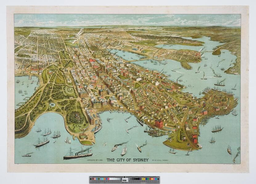 - Image of an aerial landscape view of the city and harbors of Sydney, Australia, showing the urban landscape and ports bustling with ships.
