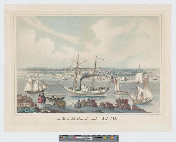 - Image of an eye-level landscape view of boats on the Detroit River, including one steamboat named "Walk-In-the-Water," with people sitting on the shore and the city of Detroit, Michigan, in the far distance.