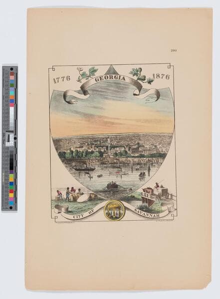 - Image of an elevated landscape view of a waterfront scene with boats, and the city of Savannah, Georgia, in the distance, in a shield motif; vignettes of the seal of Georgia, African American workers unloading barrels, and a horse-drawn cart going over a bridge.