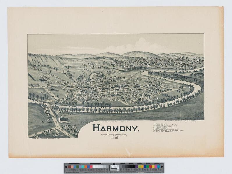 - Image of an aerial landscape view of the borough of Harmony in Butler County, Pennsylvania, and the Connoquenessing Creek and the surrounding hills, showing labeled streets with references printed in the margin.