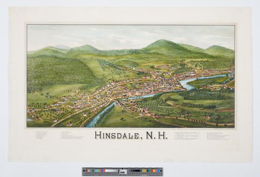 - Image of an aerial landscape view of the town of Hinsdale, New Hampshire, nestled in the hills along the Ashuelot River; location key printed in margin.