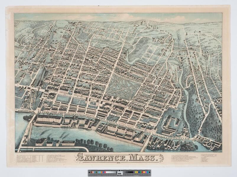 - Image of an aerial landscape view of the city of Lawrence, Massachusetts, showing the Merrimack River; map key printed in margin.