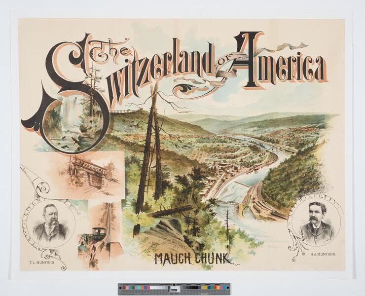 - Image of an elevated landscape view of the town of Mauch Chunk, Pennsylvania, the Lehigh River, and surrounding mountains, with a railroad bridge and train in the distance; fiver vignettes of railway cars, waterfalls, and head-and-shoulders portraits of T. L. Mumford and H. J. Mumford, managers of the switch back railroad.