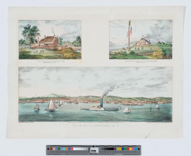 - Image of three views: an elevated landscape view of Newburgh, New York, from across the Hudson River with steam ferry and sailboats in the foreground in lower half; an eye-level view of American Revolutionary War General Henry Knox's military headquarters building with cows, barns, and bridge over water in Mortonville, New York, in upper right; and an eye-level view of General George Washington's headquarters in Newburgh with soldiers with canons in upper left.