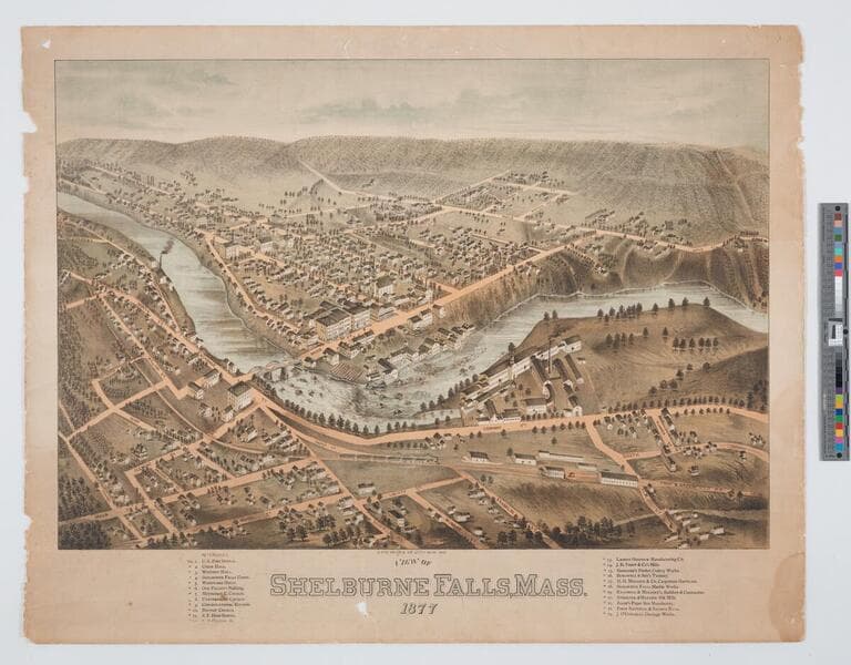 - Image of an aerial landscape view of the town of Shelburne Falls, Massachusetts, and surrounding hills, bisected by the Deerfield River; location key printed in bottom margin.