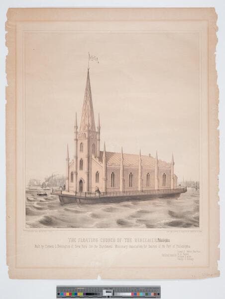 Image of an eye-level view of St. Ann's Church for deaf-mutes located in New York City; parishioners stand or walk in groups outside the front door; lists of former members of the vestry and current rector, wardens, and vestrymen at bottom center.