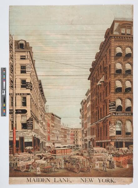 - Image of an eye-level street view of the busy intersection at Maiden Lane and Broadway in New York City, with utility poles and shop signs covering the mid-rise buildings, and the streets filled pedestrians, horse-drawn trolleys, carts with goods including a fruit cart, wagons, and a United States mail wagon.
