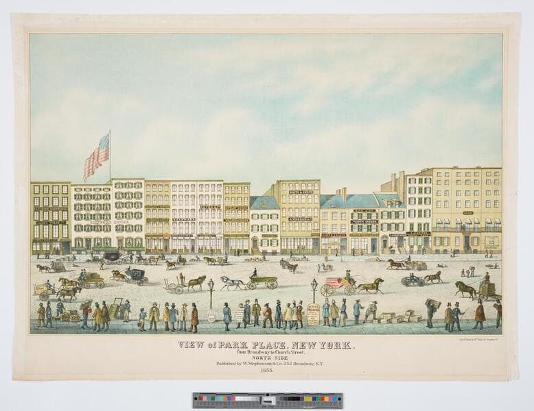 - Image of an elevated street view of Park Place in New York City showing mid-rise buildings with store signage, a cobblestone street filled with horse-drawn carriages and wagons, and sidewalks with men engaged in commercial activities.