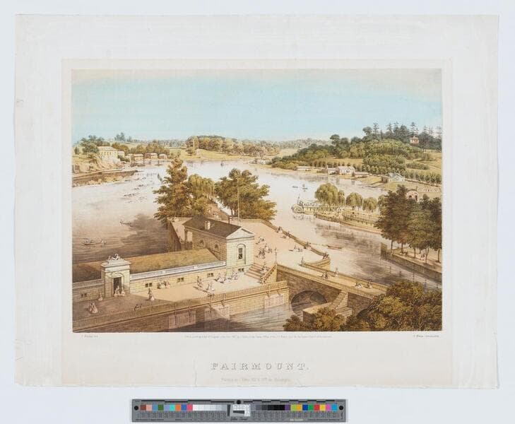 - Image of an elevated landscape view of the Fairmount Water Works in Philadelphia, Pennsylvania, showing the Schuylkill River with waterfalls, boats, and trees and buildings on the banks and hillsides, and the waterworks' pump house and bridge in the foreground, with strolling visitors.