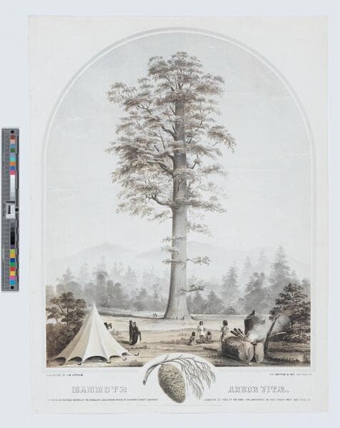 - Image of an eye-level landscape view of a large sequoia redwood tree in Calaveras County, California, with Native Americans, a tipi, and white tourists in formal dress viewing the tree; a to-scale drawing of a pine cone on a branch at bottom center.