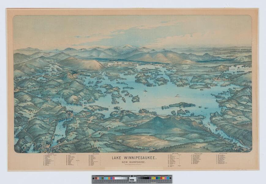 - Image of an aerial landscape view of Lake Winnipesaukee, New Hampshire, and surrounding lakes, bays, mountains and towns, often labeled; legend of islands and mountains in the margin.