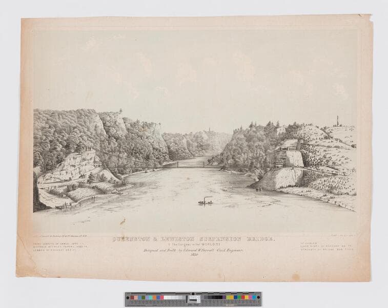 - Image of an elevated landscape view of a suspension bridge across the gorge between Lewiston, New York, and Ontario, Canada, as seen from the Niagara River, and showing winding roads with pedestrians and horses leading into the mountains on both sides, and boats and a steamboat ferry in the water; bridge details printed in bottom margin.