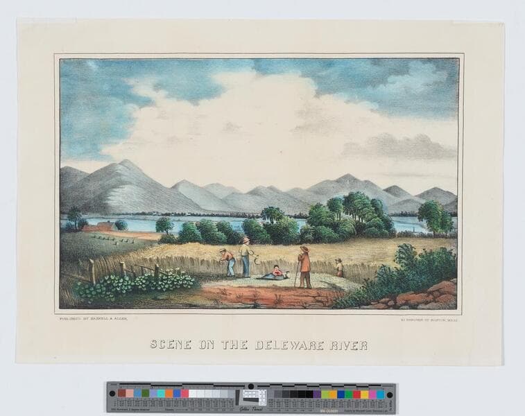 - Image of an eye-level landscape view of people harvesting wheat, with a child sitting in the center of the field, and trees, a house, the Delaware River, and mountains in the background.