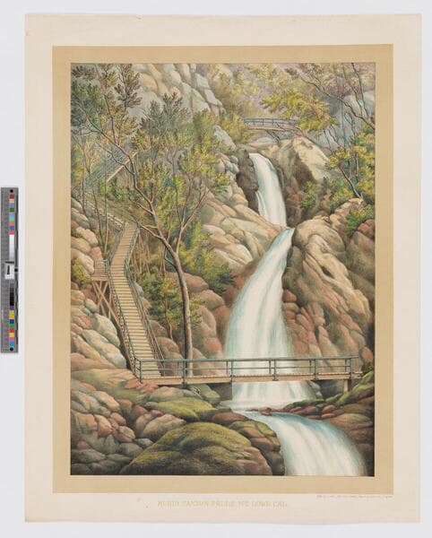 - Image of an eye-level close-up view of the Rubio Canyon Falls near Mount Lowe in Los Angeles County, California, with a stair walkway and bridge across the rocks and waterfalls.