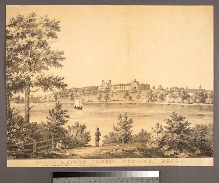 Image of an eye-level landscape view of a lake with two men in a rowboat, trees, and a white house on the left shore in the foreground, and hills and a mountain in the distance.