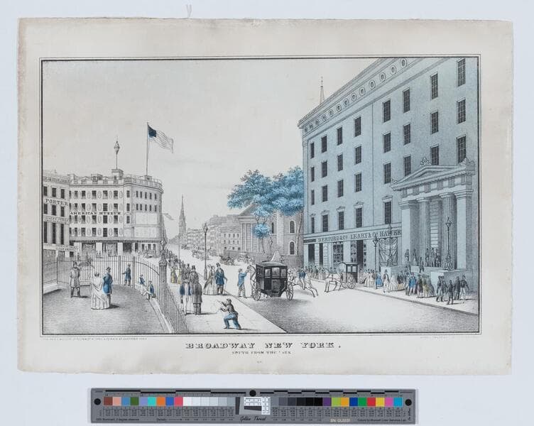 - Image of an eye-level street view of Broadway road in New York City showing the American Museum on the right and mid-rise buildings, with some storefront signage, lining the street into the distance, and a busy street scene with pedestrians and horse-drawn carriages.