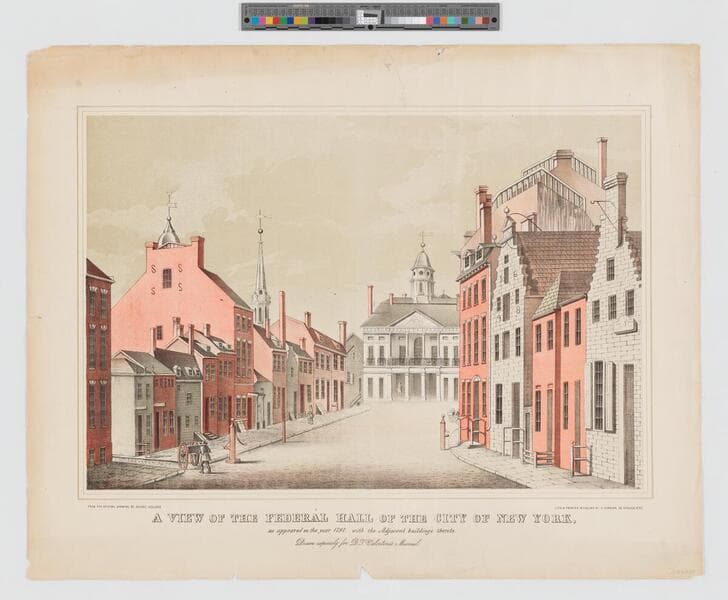 - Image of an eye-level street view of Broad Street in New York City, depicted in the late 18th century, with the Federal Hall city government building in the center background, and adjacent brick buildings and a cobblestone street in the foreground.