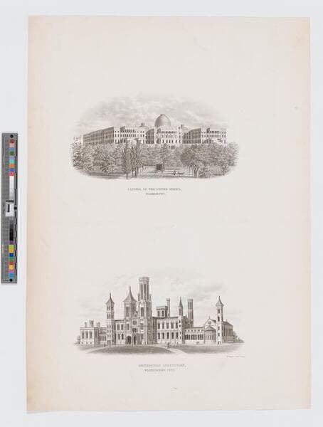- Image of two eye-level street views showing the United States Capitol building as seen from a tree-lined street (upper image), and the "Castle" building of the Smithsonian Institution (lower image) in Washington, D.C.
