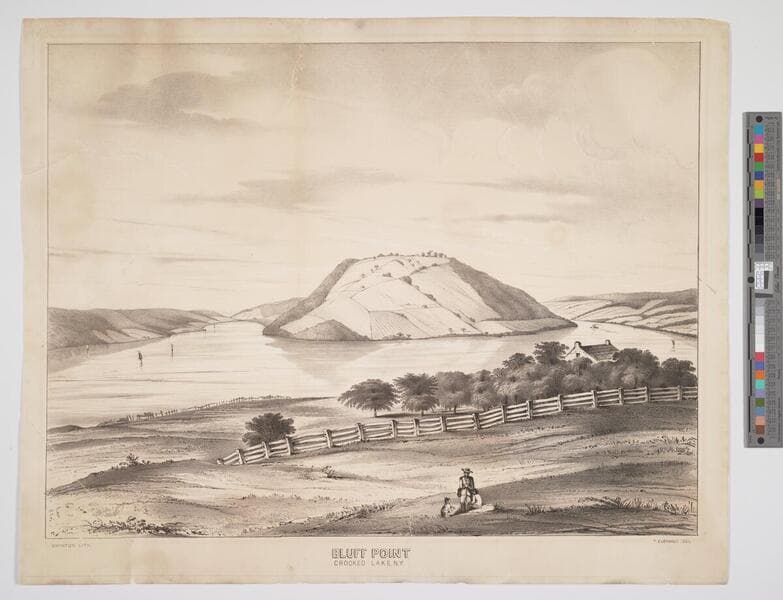 - Image of an elevated landscape view of Crooked Lake (now called Keuka Lake) in Yates County in the Finger Lakes Region of New York State, looking out from a hillside towards fields, a fence, trees, and the rooftop of a house, with the lake, scattered boats, surrounding hills, and the large hill of Bluff Point in the center; a dog and two people are in the immediate foreground.