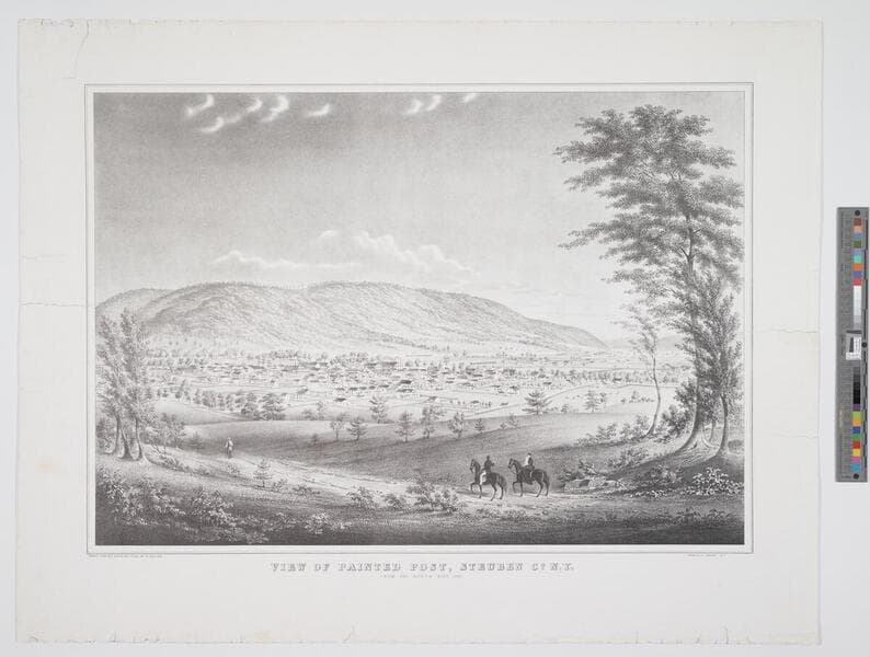 - Image of an eye-level landscape view of the town of Painted Post and surrounding hillsides in Steuben County, New York, as seen from a hill with trees, a path, and a man and woman on horseback in the foreground.