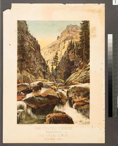 - Image of an eye-level landscape view of the Toltec Gorge in northern New Mexico with a waterfall and boulders in the foreground and mountain walls and a train in the distance.