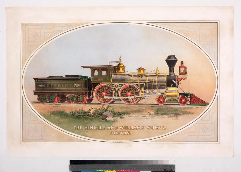 Image of an elevation view of the side of a steam locomotive, with a 4-4-0 wheel arrangement, tender with the label "Hinkley", the label "Hinkley & Williams Works Boston, Mass." on a decorative circle between the driving wheels, the label "H. & W. W." on the cylinder, a small image of a landscape on the head light, and some rocks and shrubs in the foreground.