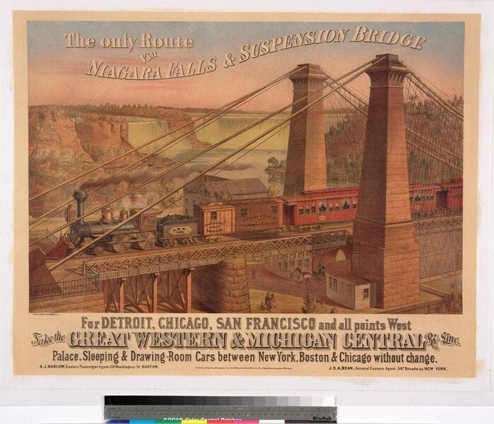 The only route via Niagara Falls & suspension bridge: for Detroit, Chicago, San Francisco and all points west take the Great Western & Michigan Central R'y Line