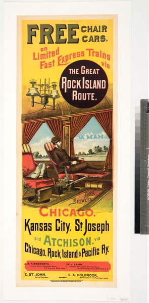 Free chair cars. on the limited fast express trains via the Great Rock Island route