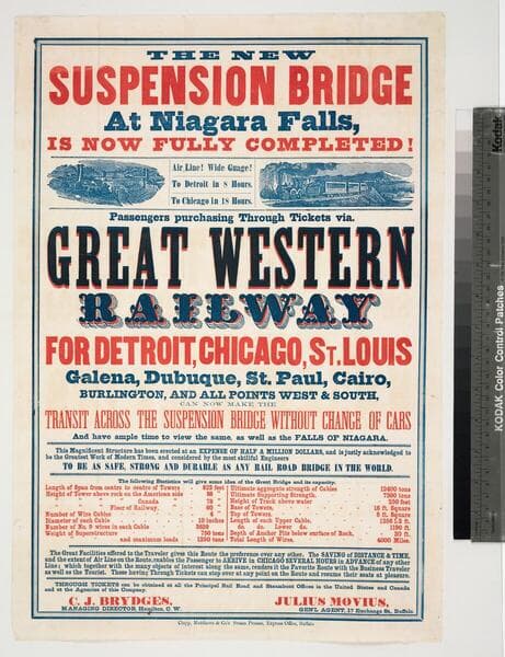 The only route via Niagara Falls & suspension bridge: for Detroit, Chicago, San Francisco and all points west take the Great Western & Michigan Central R'y Line
