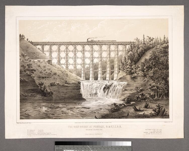 - Image of an eye-level landscape view looking up from the Genesee River in Wyoming County and Livingston County, New York, towards a steam locomotive train crossing the wooden trestle Portage Bridge above, with forested and rocky hillsides, the waterfall below, and visitors standing on the rocks and bridge.