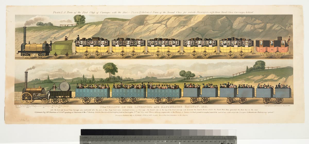 Image of an elevation view of the side of a railroad train of the Mohawk and Hudson Railway depicted in 1832 as a silhouette, with a steam locomotive, with a 2-2-0 wheel arrangement, tender with two barrels of wood and a pile of wood, and two attached carriages holding passengers, with doors labeled "M&H RPG No. 1" and "No. 2"; information of the "Names of Passengers, as far as can be ascertained" and "Particulars relating to the Locomotive Engine of the above Train" are printed in the bottom margin.
