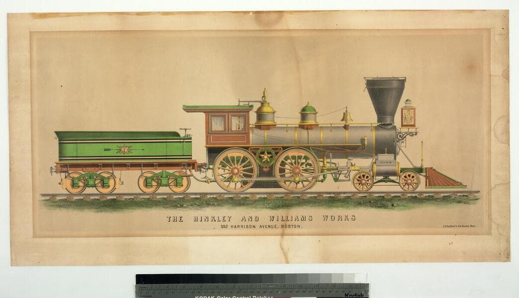 Image of an elevation view of the side of a steam locomotive, with a 4-4-0 wheel arrangement, tender with the label "Hinkley", the label "Hinkley & Williams Works Boston, Mass." on a decorative circle between the driving wheels, the label "H. & W. W." on the cylinder, a small image of a landscape on the head light, and some rocks and shrubs in the foreground.