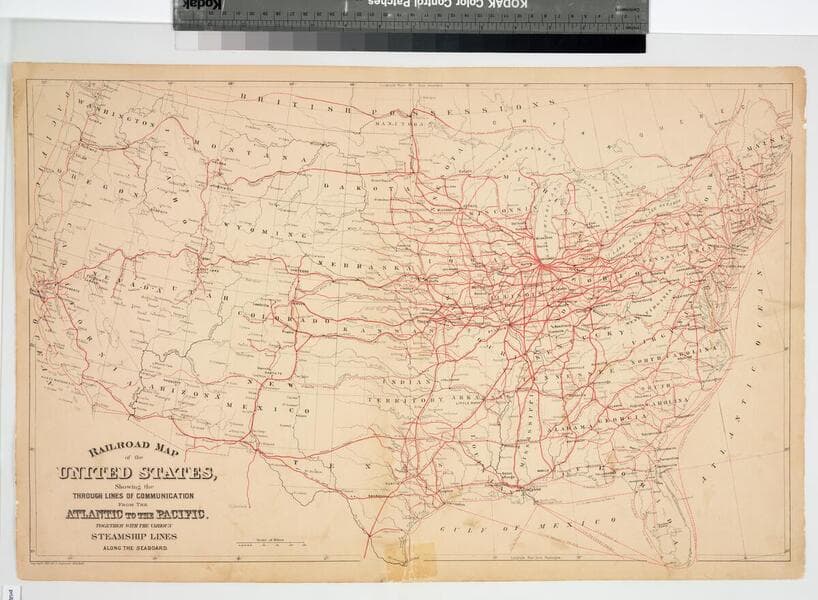 Railroad map of the United States showing through lines of communication from the Atlantic to the Pacific. Together with the steamship lines along the seaboard
