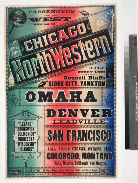 Image of a poster with text advertising the routes of the Chicago and Northwestern Railway.
