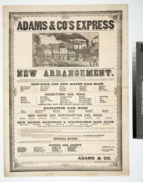 Image of a broadside advertising the American Package Express of Adams & Co's with a lithographed image captioned "View of the Great Western & New-York Depot, at South Cove, Boston" in the upper part of sheet depicting an eye-level landscape view of a railroad terminal, two trains, and surrounding buildings in Boston, Massachusetts, with two horse-drawn wagons in the foreground including one labeled "Mail."
