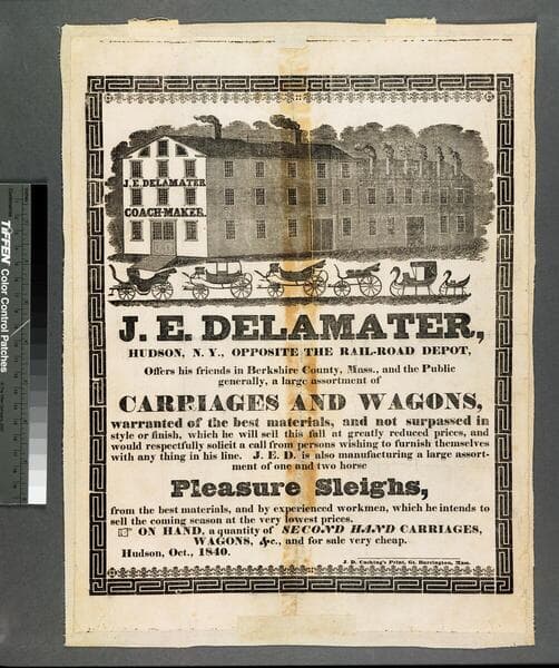 J.E. Delamater, Hudson, N.Y., opposite the rail-road depot, offers his friends in Berkshire County, Mass., and the public generally, a large assortment of carriages and wagons