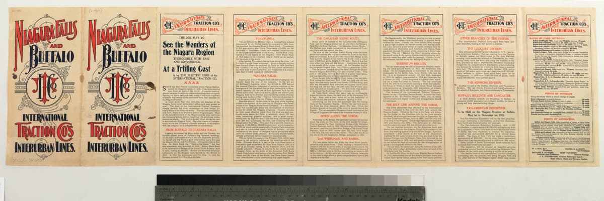 Image of a map of a portion of the Eastern United States from as far west as Omaha, Nebraska, showing railroad routes of the Michigan Central and Great Western Railroad and connecting lines, with a vignette in the lower left corner of the Niagara Falls Suspension Bridge and an inset map in the lower right corner of the Western United States showing railroad routes and titled, "Map between the Missouri River and the Pacific Ocean"; map verso contains panels with the fold-up map covers, promotional descriptions including an image of a freight car for the Great Central Route's Blue Line, and timetables.