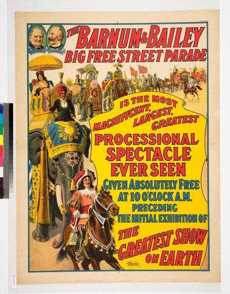 The Barnum & Bailey big free street parade : is the most magnificent, largest, greatest processional spectacle ever seen given absolutely free at 10 o'clock a.m. preceding the initial exhibition of the greatest show on earth