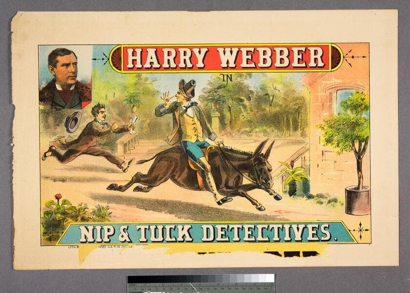 Image of two men racing carts driven by snorting horses down a crowded city street and being chased by a police officer with angry pedestrians, a dog, and storefronts in the background; vignette of a head-and-shoulders portrait of comedian and actor Harry Webber in forma dress at upper left; unfinished title panel has horseshoe decoration; the poster advertises the melodrama comedy "Nip and Tuck: or, the Great Detectives."