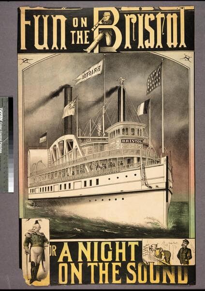 Image of a central image of a row of nine male and female performers playing household items as musical instruments including two performers in blackface portraying an African American woman playing a rolling pin as a flute and an African American man playing an umbrella; surrounded by vignettes depicting additional comedic scenes and head-and-shoulder portraits of the nine actors and actresses in the production; the poster advertises the comedy-musical show "Fun on the Bristol, Or a Night on the Sound" managed by Edward E. Rice and Henry C. Jarrett and performing at City Hall (presumably in Portland, Maine) on October 29, [1880].