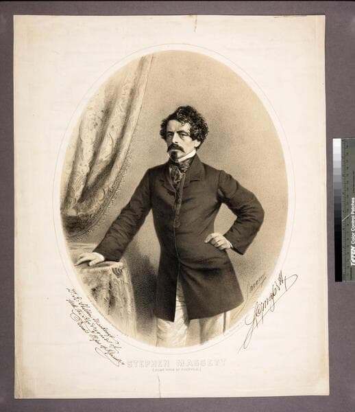 Image of a three-quarter-length portrait of Harry Montague, an actor and manager of the "Fashion Plates" musical,comedy, and burlesque company, sitting at a table with pen, ink and writing paper.