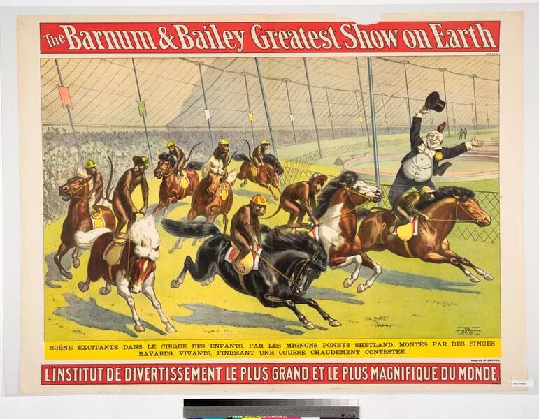 The Barnum & Bailey greatest show on Earth : scene excitante dans le cirque des enfants, par les mignons poneys Shetland, montes par des singes bavards, vivants, finissant une course chaudement contestee