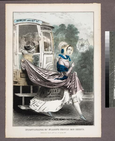 Image of a political cartoon depicting a tearful Confederate President Jefferson Davis disguised in a dress and bonnet fleeing Union cavalry soldiers riding through a camp on horseback during the American Civil War; a woman (presumably his wife Varina Davis) wears hoop skirts, petticoat, and a corset without a dress as she tries to dissuade the soldiers riding into camp.