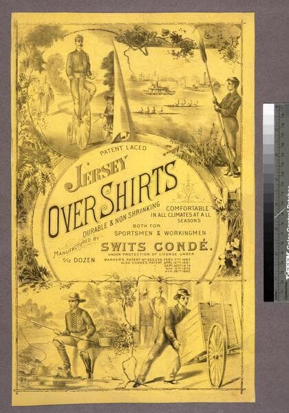 Image of two vignettes advertising Cosmopolitan shirts; top vignette features three men in formal evening attire (tail coats, trousers, collared shirts, waist coats, white ties, and gloves) in a lavish home with large staircase, folded white shirt in circular frame to the left; lower vignette shows several men and a woman at leisure or on vacation near a large body of water, collared patterned shirts worn with caps, breeches and hose worn by the men, racquet, bicycle, ladies fan, parasol, and travel bag visible; two ships in the distance, folded patterned collared shirt in circular frame to the right.