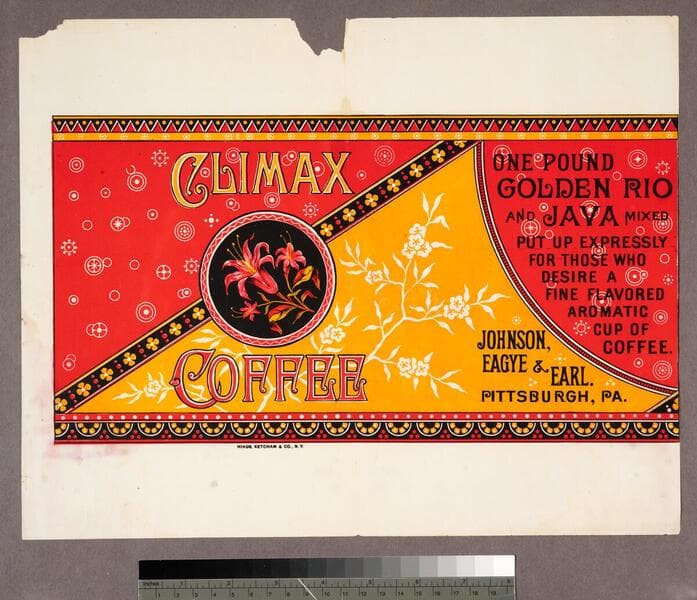 Image of a product label for Climax Coffee with red and gray floral and geometric designs; a blooming lily is featured at center in a circular frame.